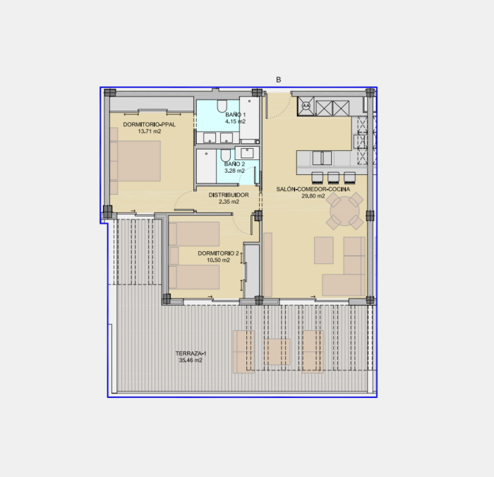 La vivienda se ha diseñado con carácter abierto compuesta de amplias ventanas para aprovechar el máximo de luz natural en todo el espacio interior. Con una cocina abierta integrada al área donde se aloja el salón y el comedor, se permite una distribución eficiente y cómoda, para proporcionar la mejor organización del espacio. Todos los apartamentos incluyen una cocina totalmente amueblada y equipada con
